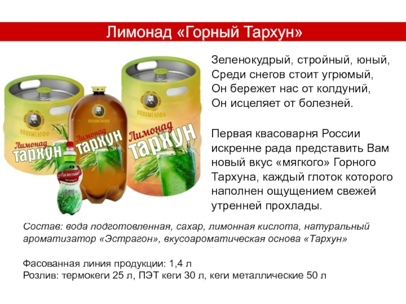 Состав: вода подготовленная, сахар, лимонная кислота, натуральный ароматизатор «Эстрагон», вкусоароматическая основа «Тархун»