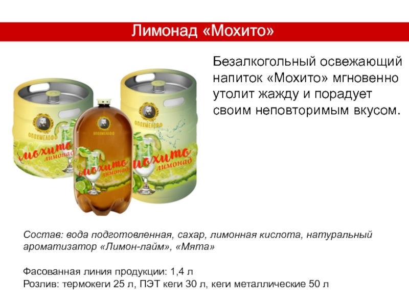 Безалкогольный освежающий напиток «Мохито» мгновенно утолит жажду и порадует своим неповторимым вкусом.