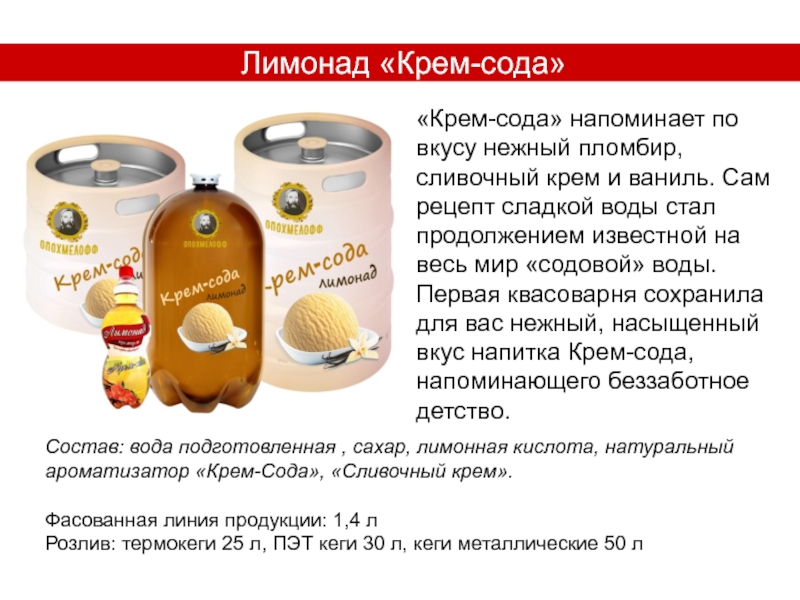 Состав: вода подготовленная , сахар, лимонная кислота, натуральный ароматизатор «Крем-Сода», «Сливочный крем».