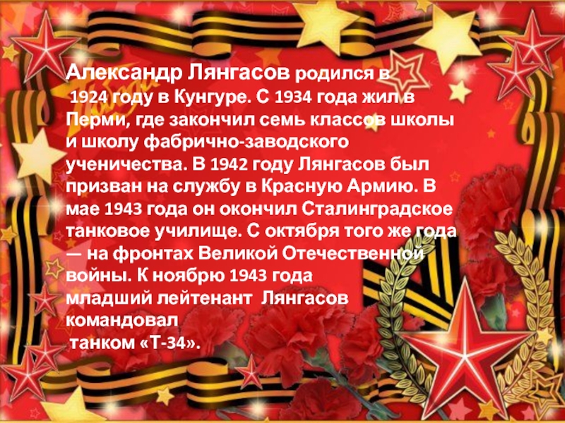 школу фабрично-заводского ученичества. В 1942 году Лянгасов был призван на службу в Красную Армию. В мае 1943 года он окончил Сталинградское танковое училище. С октября того же года — на фронтах Великой Отечественнойвойны. К ноябрю 1943 года