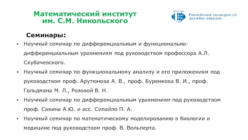 Слайд 10Научный семинар по дифференциальным и функционально- дифференциальным уравнениям под руководством