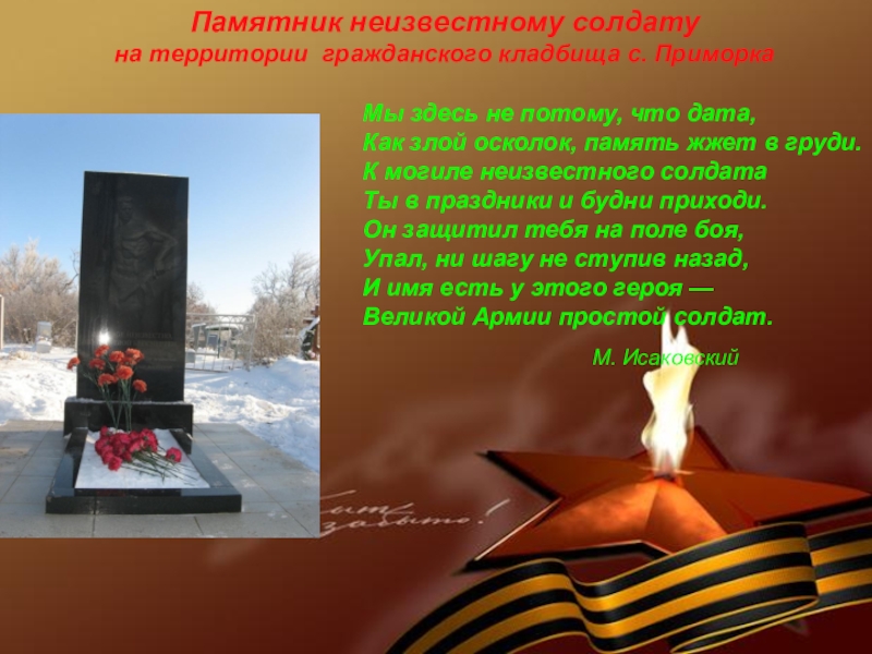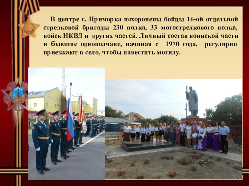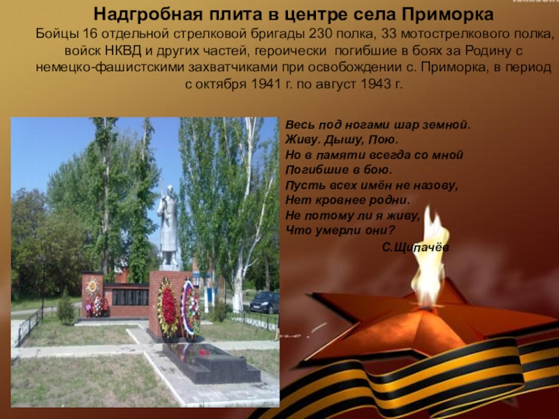 Бойцы 16 отдельной стрелковой бригады 230 полка, 33 мотострелкового полка, войск НКВД и других частей, героически погибшие в боях за Родину с немецко-фашистскими захватчиками при освобождении с. Приморка, в период с октября 1941 г. по август 1943 г.