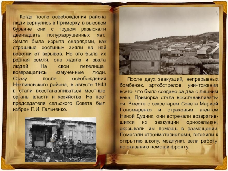 После двух эвакуаций, непрерывных бомбежек, артобстрелов, уничтожения всего, что было создано за два с лишним века, Приморка стала восстанавливать-ся. Вместе с секретарем Совета Марией Пономаренко и страховым агентом Ниной Дудник, они встречали возвратив-шихся из эвакуации односельчан, оказывали им помощь в размещении. Помогали стройматериалами, готовили к открытию школу, медпункт, вели работу по оказанию помощи фронту.
