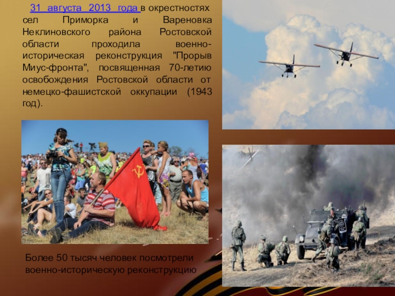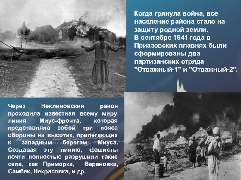Через Неклиновский район проходила известная всему миру линия Миус-фронта, которая представляла собой три пояса обороны на высотах, прилегающих к западным берегам Миуса. Создавая эту линию, фашисты почти полностью разрушили такие села, как Приморка, Вареновка, Самбек, Некрасовка, и др.
