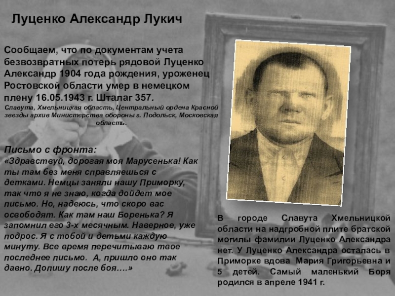 В городе Славута Хмельницкой области на надгробной плите братской могилы фамилии Луценко Александра нет. У Луценко Александра осталась в Приморке вдова Мария Григорьевна и 5 детей. Самый маленький Боря родился в апреле 1941 г.