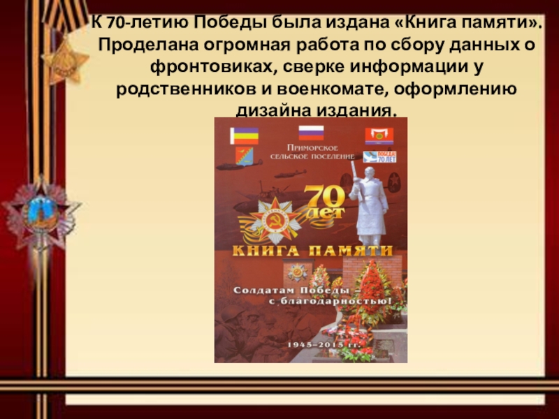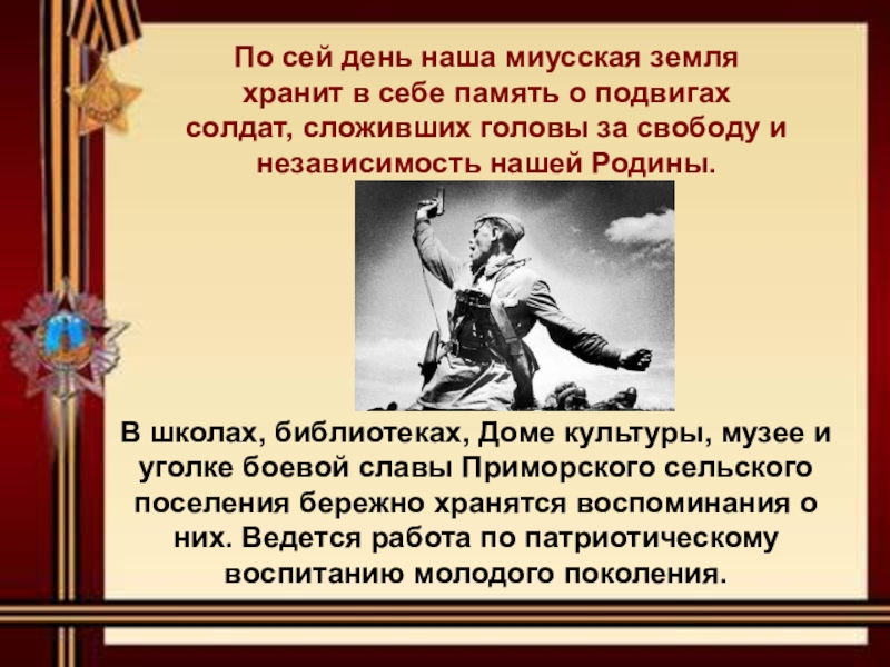 В школах, библиотеках, Доме культуры, музее и уголке боевой славы Приморского сельского поселения бережно хранятся воспоминания о них. Ведется работа по патриотическому воспитанию молодого поколения.