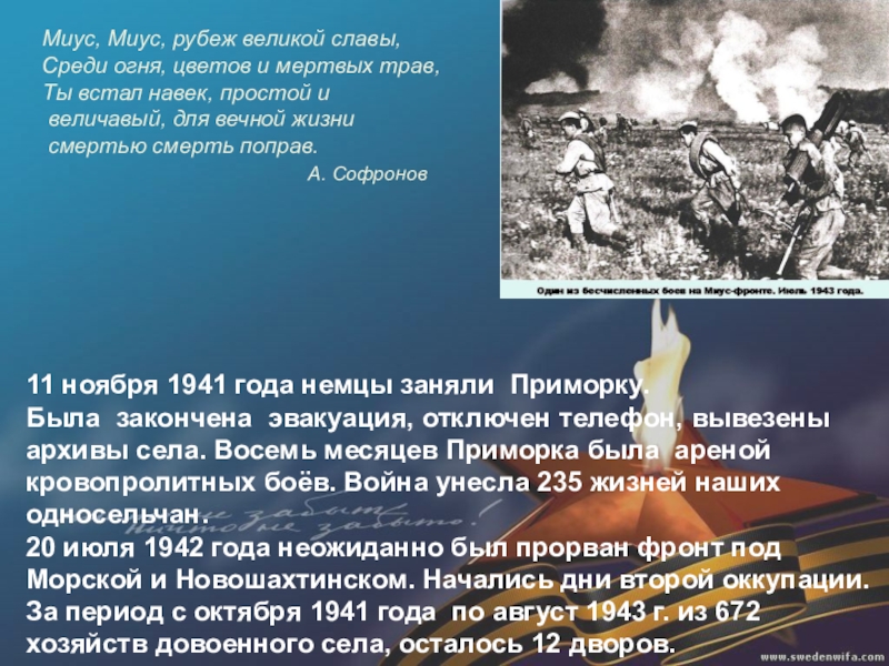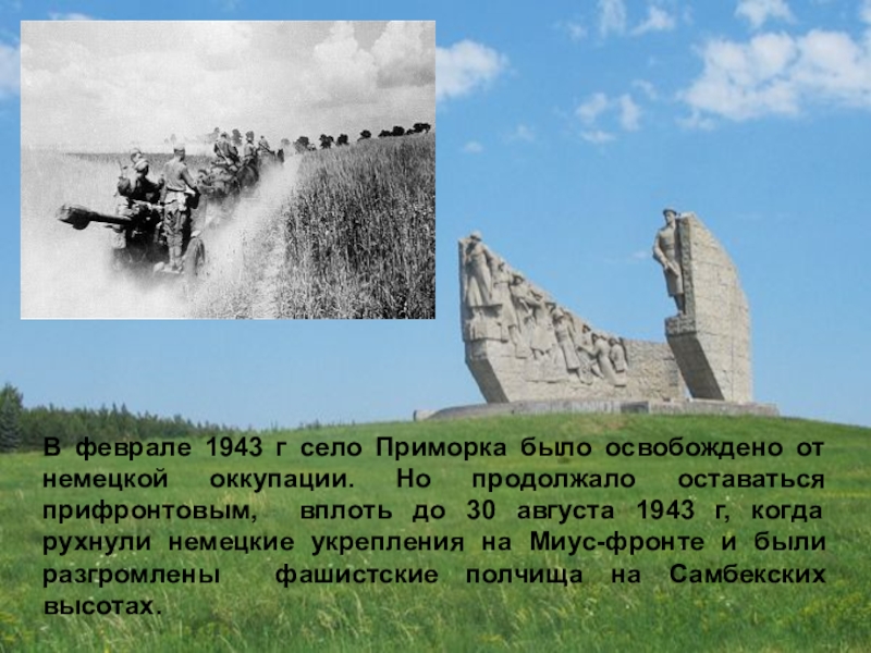 Была закончена эвакуация, отключен телефон, вывезены архивы села. Восемь месяцев Приморка была ареной кровопролитных боёв. Война унесла 235 жизней наших односельчан.
