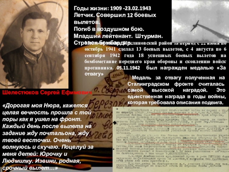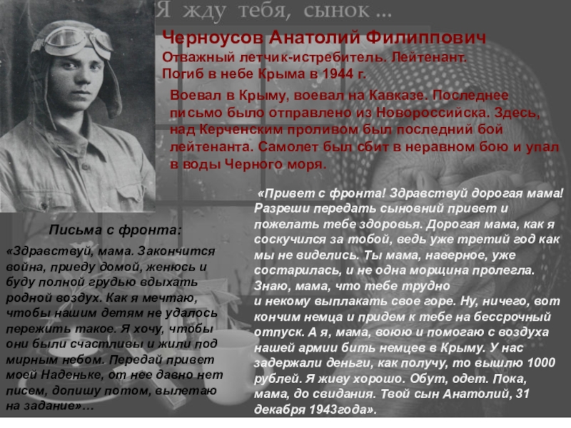 «Здравствуй, мама. Закончится война, приеду домой, женюсь и буду полной грудью вдыхать родной воздух. Как я мечтаю, чтобы нашим детям не удалось пережить такое. Я хочу, чтобы они были счастливы и жили под мирным небом. Передай привет моей Наденьке, от нее давно нет писем, допишу потом, вылетаю на задание»…