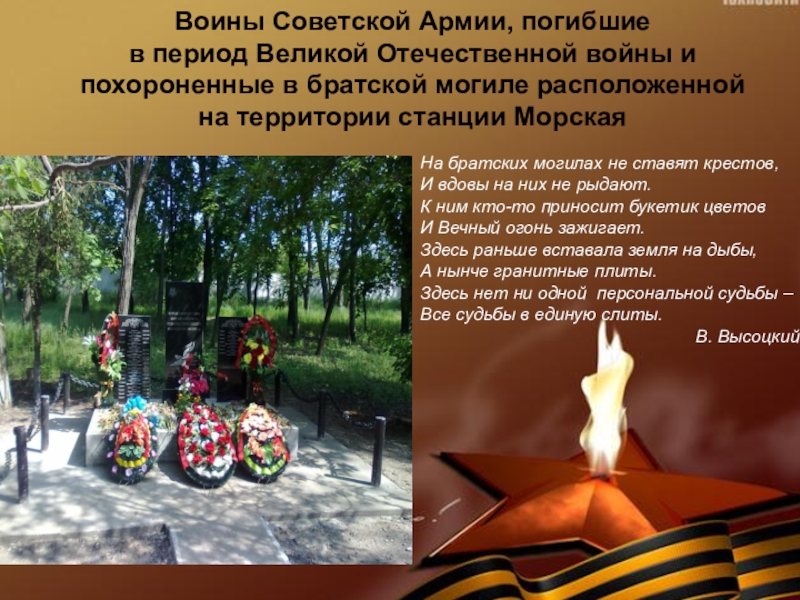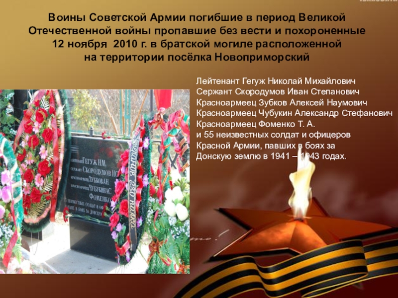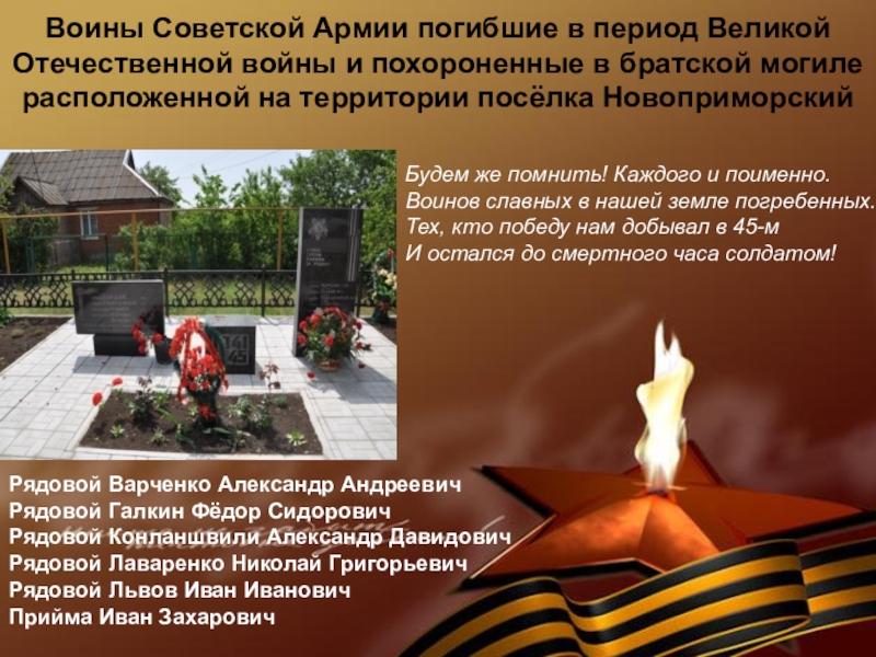 Воины Советской Армии погибшие в период Великой Отечественной войны и похороненные в братской могиле расположенной на территории посёлка Новоприморский