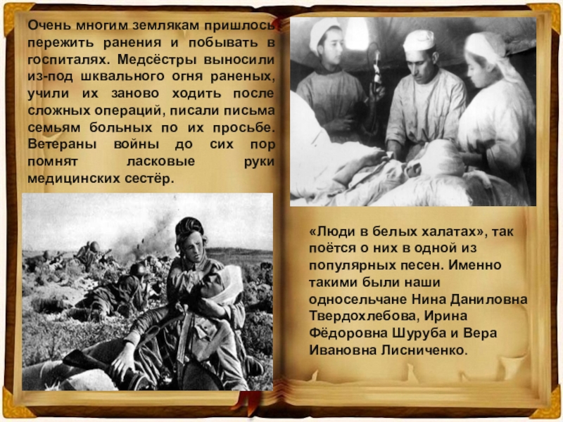 «Люди в белых халатах», так поётся о них в одной из популярных песен. Именно такими были наши односельчане Нина Даниловна Твердохлебова, Ирина Фёдоровна Шуруба и Вера Ивановна Лисниченко.