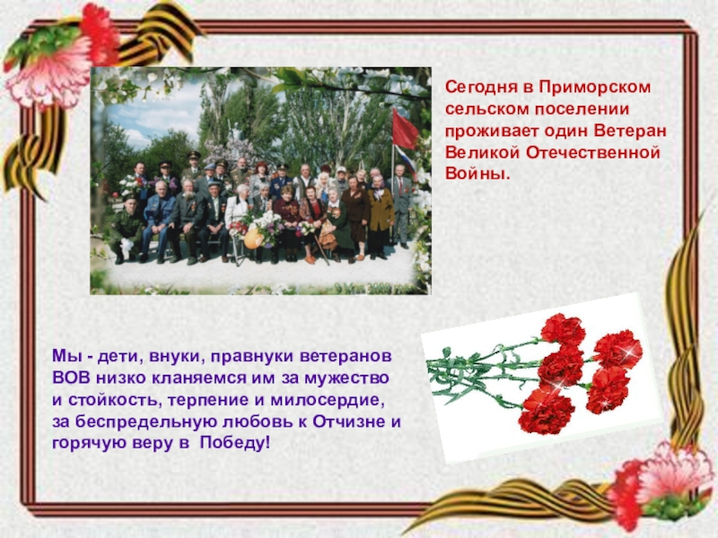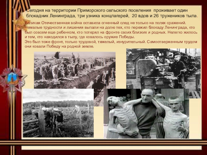 Сегодня на территории Приморского сельского поселения проживает один блокадник Ленинграда, три узника концлагерей, 20 вдов и 26 тружеников тыла.
