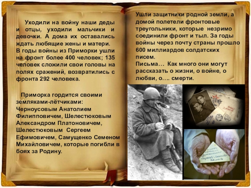 Ушли защитники родной земли, а домой полетели фронтовые треугольники, которые незримо соединили фронт и тыл. За годы войны через почту страны прошло 600 миллиардов солдатских писем.