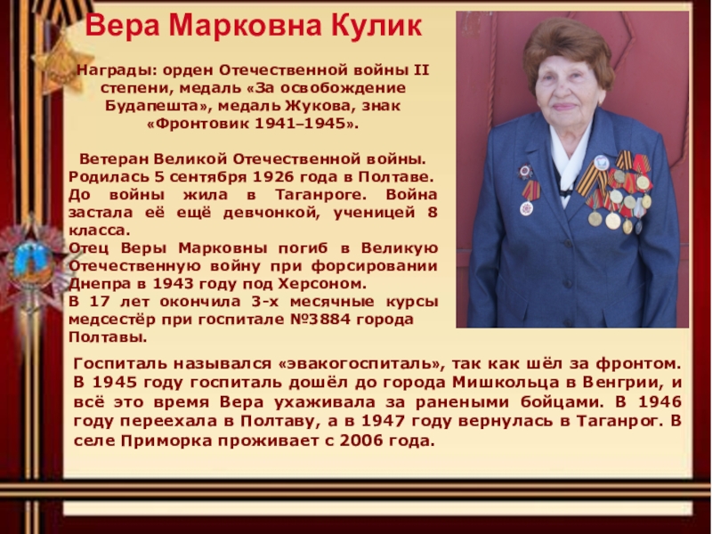 Госпиталь назывался «эвакогоспиталь», так как шёл за фронтом. В 1945 году госпиталь дошёл до города Мишкольца в Венгрии, и всё это время Вера ухаживала за ранеными бойцами. В 1946 году переехала в Полтаву, а в 1947 году вернулась в Таганрог. В селе Приморка проживает с 2006 года.