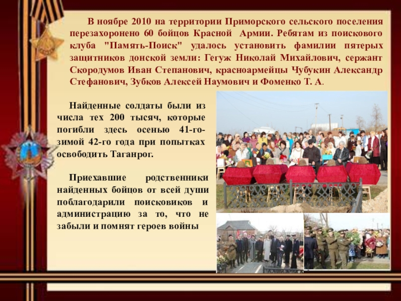 Найденные солдаты были из числа тех 200 тысяч, которые погибли здесь осенью 41-го-зимой 42-го года при попытках освободить Таганрог.