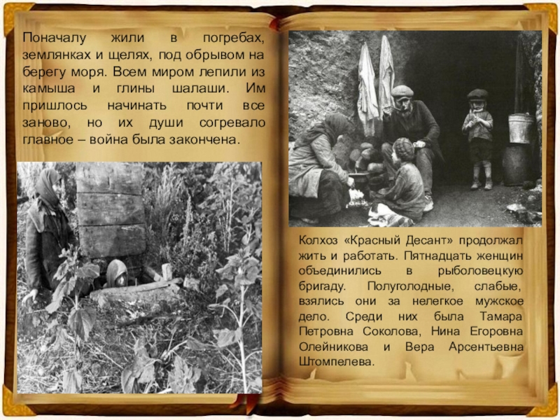 Колхоз «Красный Десант» продолжал жить и работать. Пятнадцать женщин объединились в рыболовецкую бригаду. Полуголодные, слабые, взялись они за нелегкое мужское дело. Среди них была Тамара Петровна Соколова, Нина Егоровна Олейникова и Вера Арсентьевна Штомпелева.