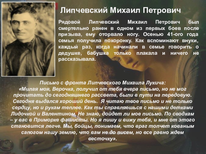 «Милая моя, Верочка, получил от тебя вчера письмо, но не мог прочитать до сегодняшнего рассвета, были в пути на передовую. Сегодня выдался хороший день. Я читаю твое письмо и не только сердцу, но и рукам теплее. Как ты справляешься с нашими детками Лидочкой и Валентином. Не знаю, дойдет ли мое письмо. По сводкам – у вас в Приморке фашисты. Но я пишу и вижу тебя, и мне от этого становится легче. Мы, бойцы, понимаем, что враг топчет кованым сапогом нашу землю, что вам не до писем, но все равно ждем весточку».