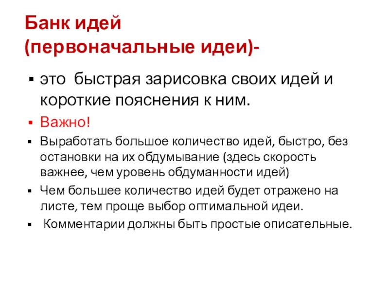 обдумывание (здесь скорость важнее, чем уровень обдуманности идей)Чем большее количество идей будет отражено на листе, тем проще выбор оптимальной идеи.