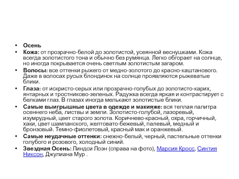 Самые выигрышные цвета в одежде и макияже: вся теплая палитра осеннего неба, листвы и земли. Золотисто-голубой, лазоревый, изумрудный, цвет старого золота. Коричнево-красный, охра, горчичный, хаки, цвет шампанского, желтовато-бежевый, палевый, медный и бронзовый. Темно-фиолетовый, красный мак и оранжевый.