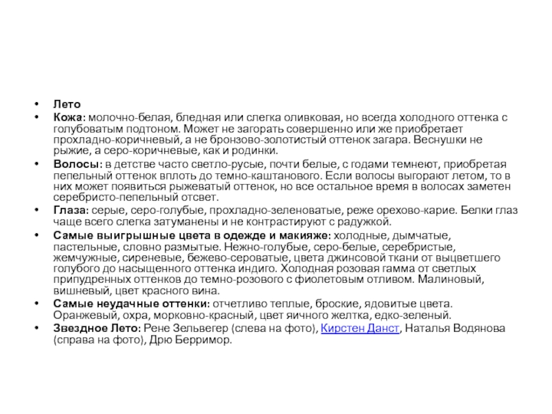 Кожа: молочно-белая, бледная или слегка оливковая, но всегда холодного оттенка