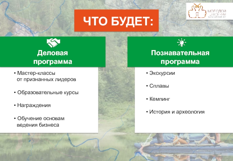 Что будет:Деловая программаПознавательная программа• Мастер-классы  от признанных лидеров 	• Образовательные курсы• Награждения• Обучение основам  ведения