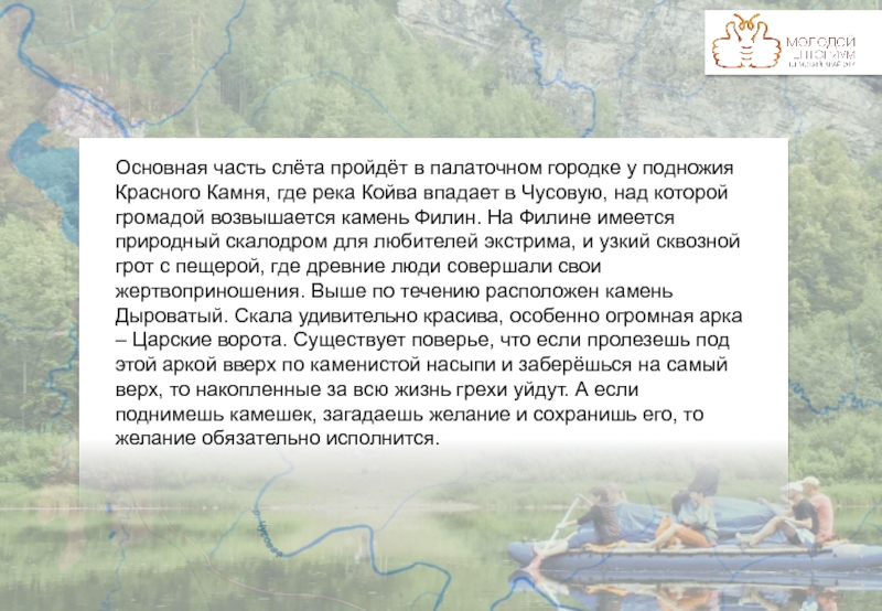 Основная часть слёта пройдёт в палаточном городке у подножия Красного Камня, где река Койва впадает в Чусовую,