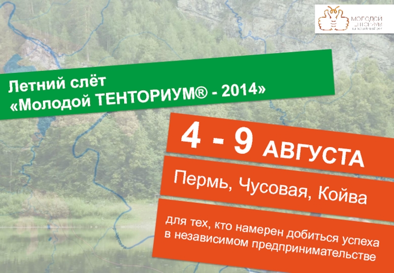 Летний слёт «Молодой ТЕНТОРИУМ® - 2014»4 - 9 августаПермь, Чусовая, Койвадля тех, кто намерен добиться успеха в