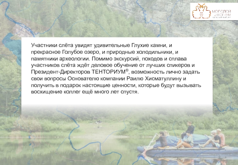 сплава участников слёта ждёт деловое обучение от лучших спикеров и Президент-Директоров ТЕНТОРИУМ®, возможность лично задать свои вопросы Основателю компании Раилю Хисматуллину и получить в подарок настоящие ценности, которые будут вызывать восхищение коллег ещё много лет спустя.