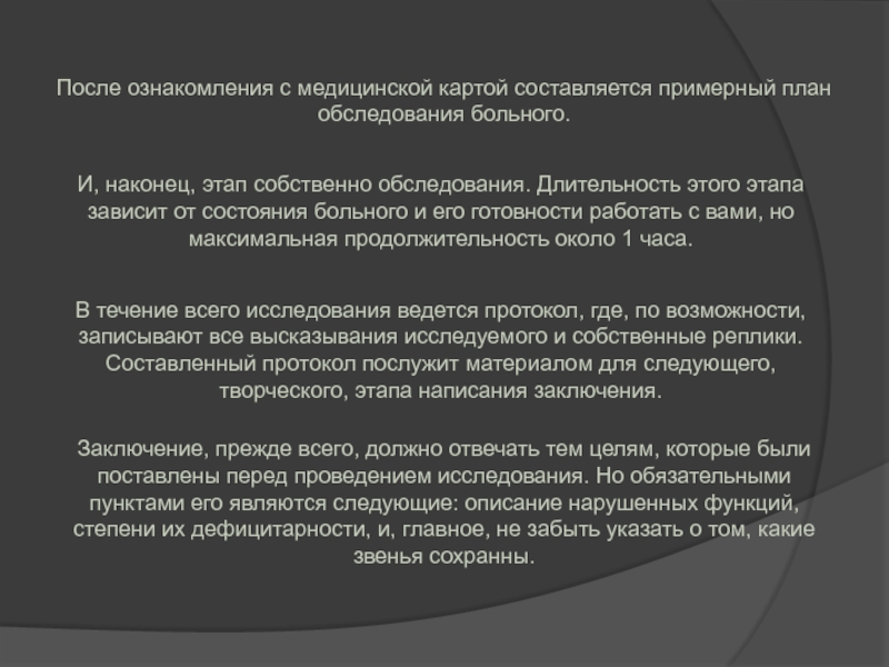 Заключение, прежде всего, должно отвечать тем целям, которые были поставлены перед проведением исследования. Но обязательными пунктами его являются следующие: описание нарушенных функций, степени их дефицитарности, и, главное, не забыть указать о том, какие звенья сохранны.