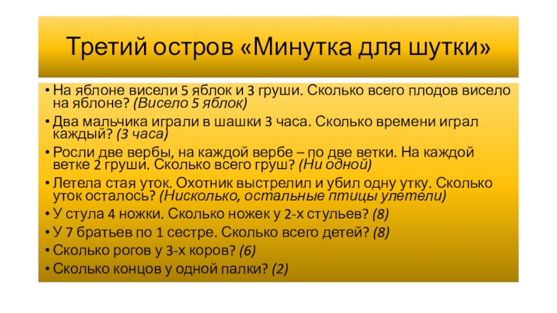 Третий остров «Минутка для шутки»На яблоне висели 5 яблок и 3 груши. Сколько всего плодов висело на