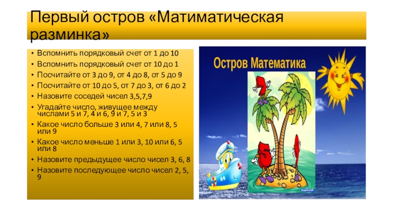 Первый остров «Матиматическая разминка»Вспомнить порядковый счет от 1 до 10Вспомнить порядковый счет от 10 до 1Посчитайте от
