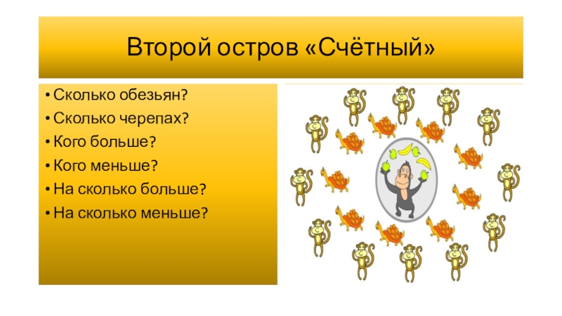 Второй остров «Счётный»Сколько обезьян?Сколько черепах?Кого больше?Кого меньше?На сколько больше?На сколько меньше?