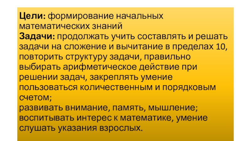 Цели: формирование начальных математических знаний Задачи: продолжать учить составлять и решать задачи на сложение и вычитание в пределах 10, повторить структуру задачи, правильно выбирать арифметическое действие при решении задач, закреплять умение