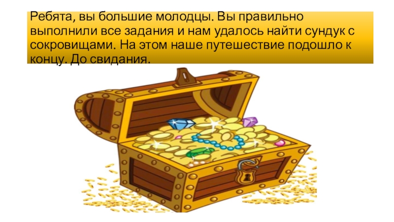 Ребята, вы большие молодцы. Вы правильно выполнили все задания и нам удалось найти сундук с сокровищами. На