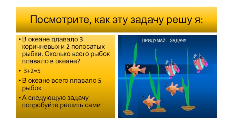 Посмотрите, как эту задачу решу я:В океане плавало 3 коричневых и 2 полосатых рыбки. Сколько всего рыбок