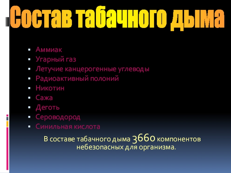 АммиакУгарный газЛетучие канцерогенные углеводыРадиоактивный полонийНикотинСажаДеготьСероводородСинильная кислотаВ составе табачного дыма 3660 компонентов небезопасных для организма.Состав табачного дыма