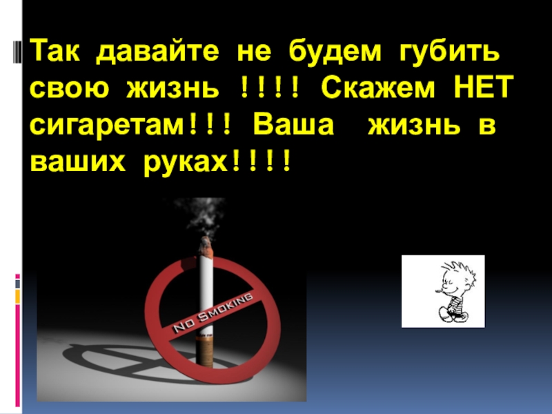 Так давайте не будем губить свою жизнь !!!! Скажем НЕТ сигаретам!!! Ваша жизнь в ваших руках!!!!
