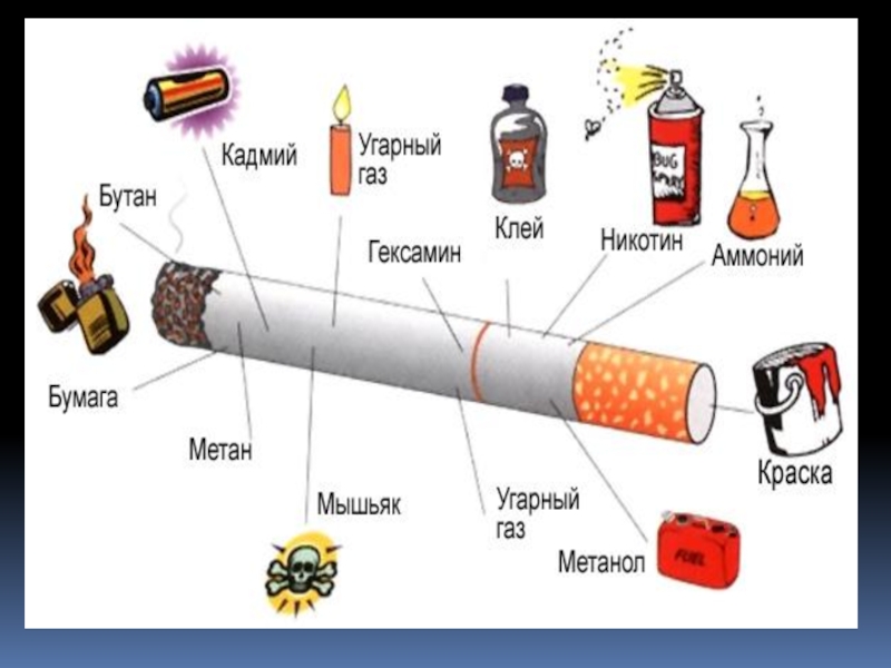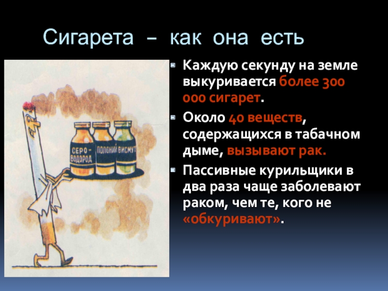 Сигарета – как она естьКаждую секунду на земле выкуривается более 300 000 сигарет.Около 40 веществ, содержащихся в
