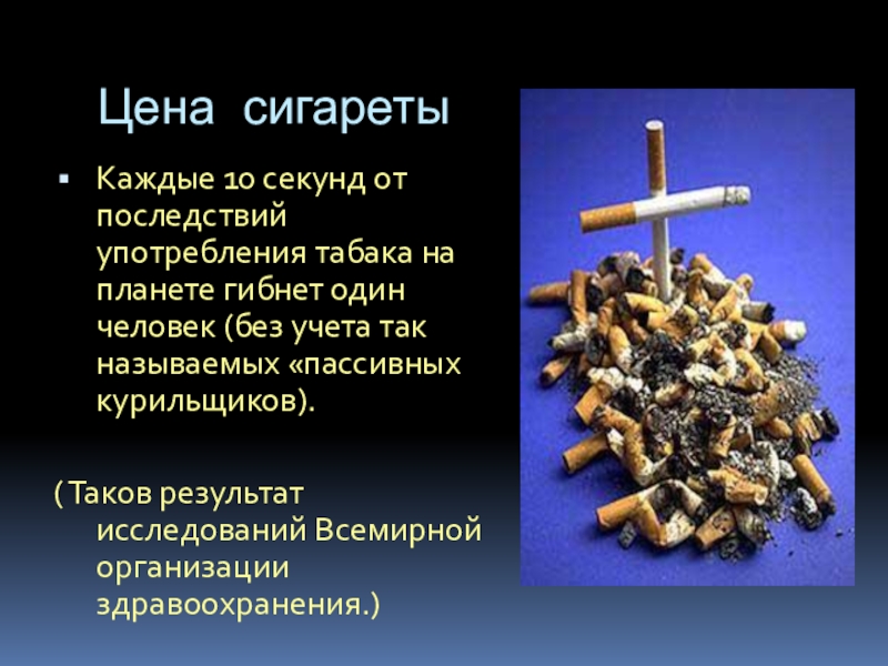 Цена сигаретыКаждые 10 секунд от последствий употребления табака на планете гибнет один человек (без учета так называемых
