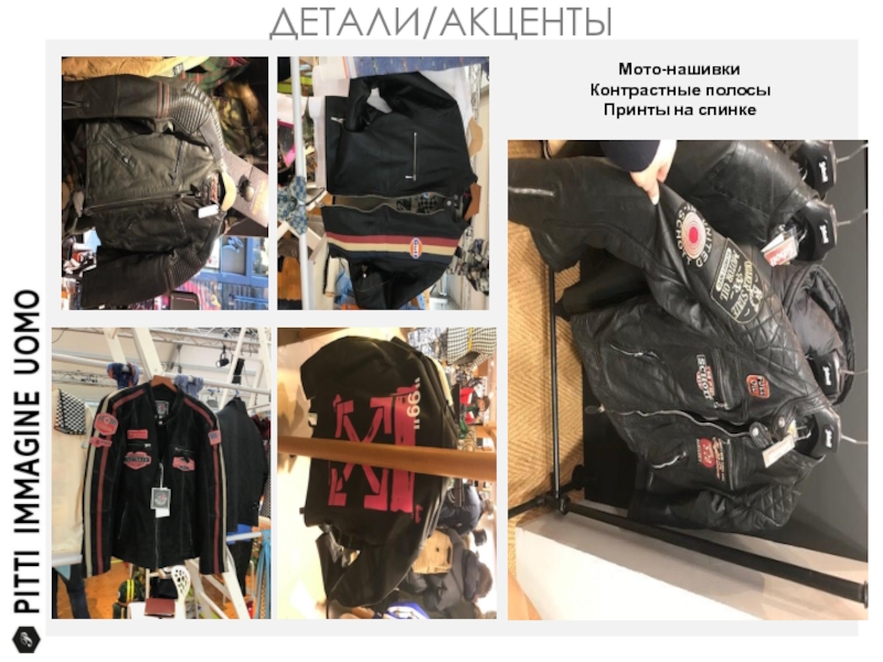 ДЕТАЛИ/АКЦЕНТЫМото-нашивкиКонтрастные полосыПринты на спинке