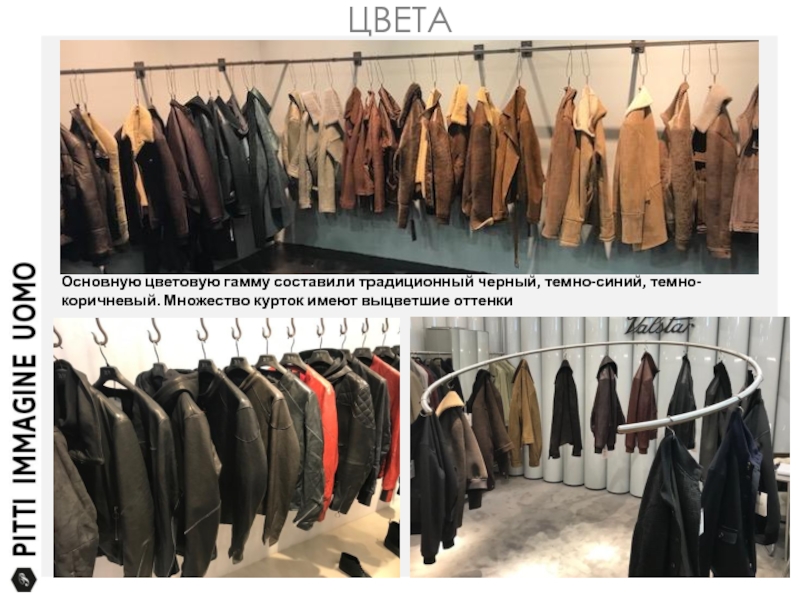 ЦВЕТАОсновную цветовую гамму составили традиционный черный, темно-синий, темно-коричневый. Множество курток имеют выцветшие оттенки