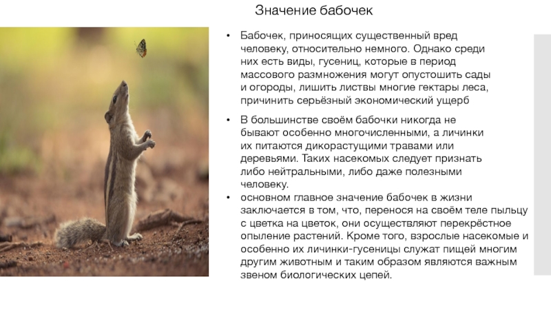 основном главное значение бабочек в жизни заключается в том, что, перенося на своём теле пыльцу с цветка на цветок, они осуществляют перекрёстное опыление растений. Кроме того, взрослые насекомые и особенно их личинки-гусеницы служат пищей многим другим животным и таким образом являются важным звеном биологических цепей.