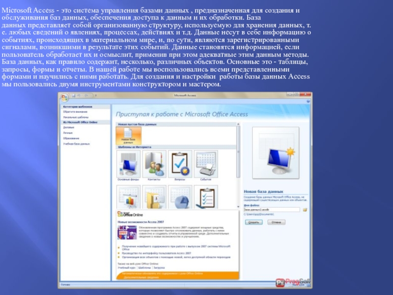 Слайд 2Microsoft Access - это система управления базами данных , предназначенная для создания
