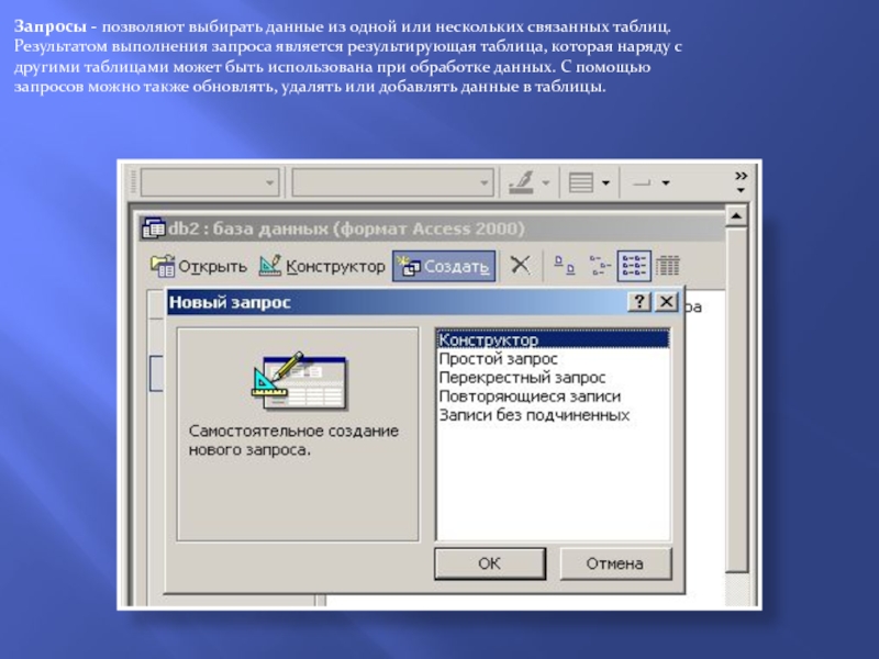 Слайд 6Запросы - позволяют выбирать данные из одной или нескольких связанных таблиц.