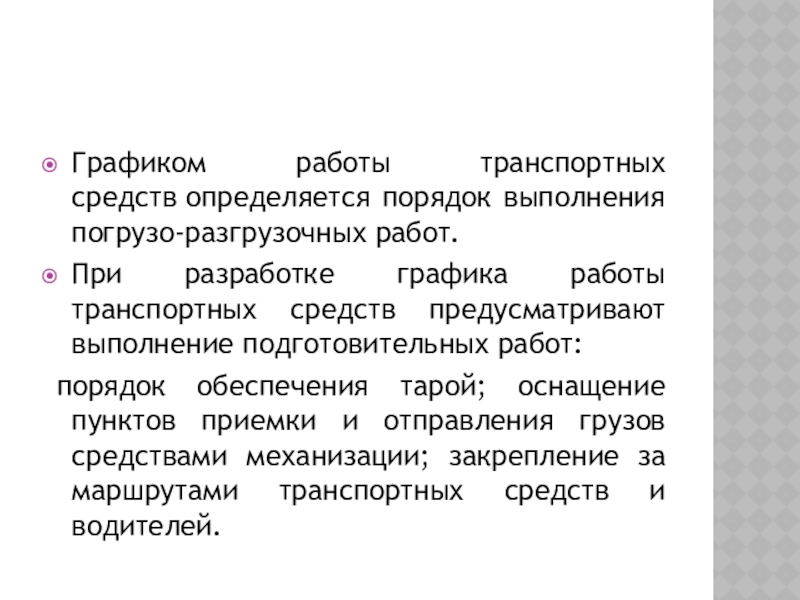 Слайд 5Графиком работы транспортных средств определяется порядок выполнения погрузо-разгрузочных работ.