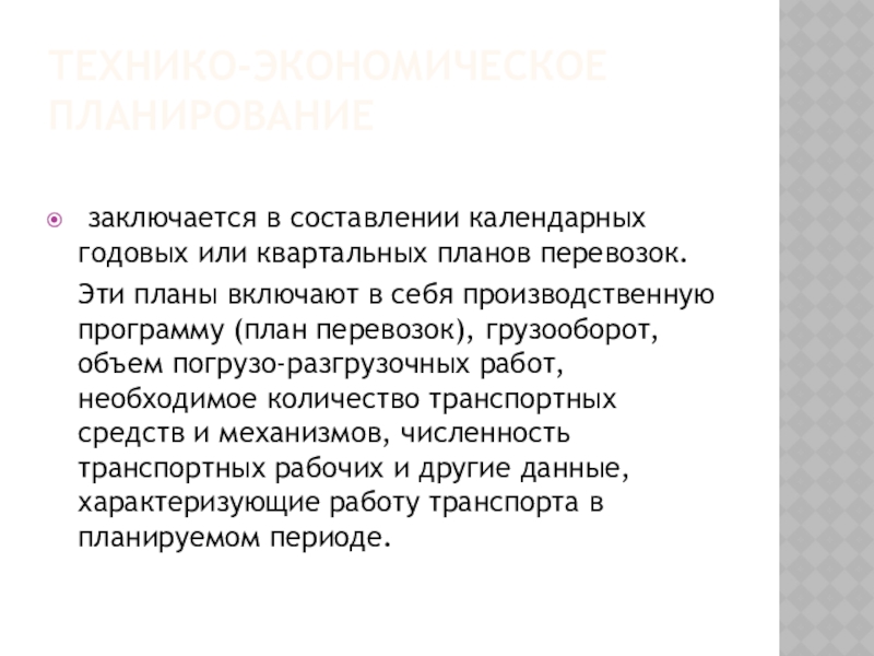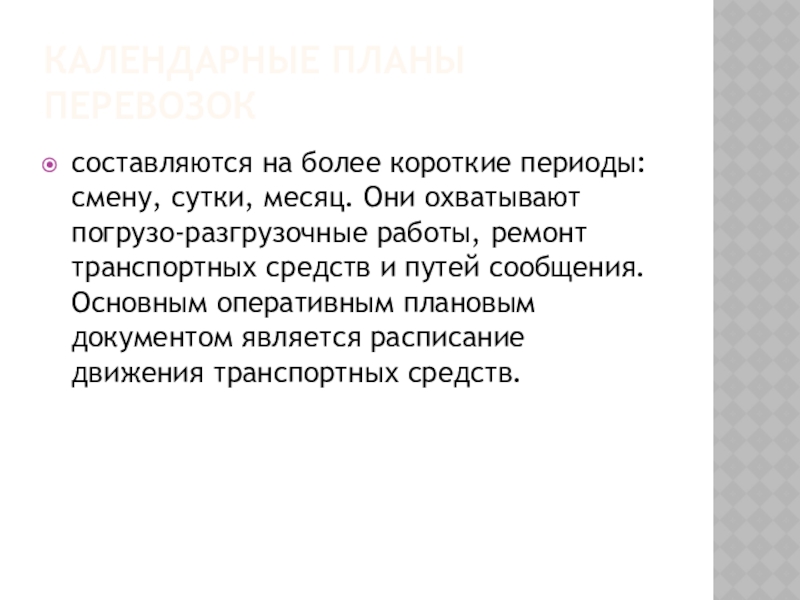 заключается в составлении календарных годовых или квартальных планов перевозок.