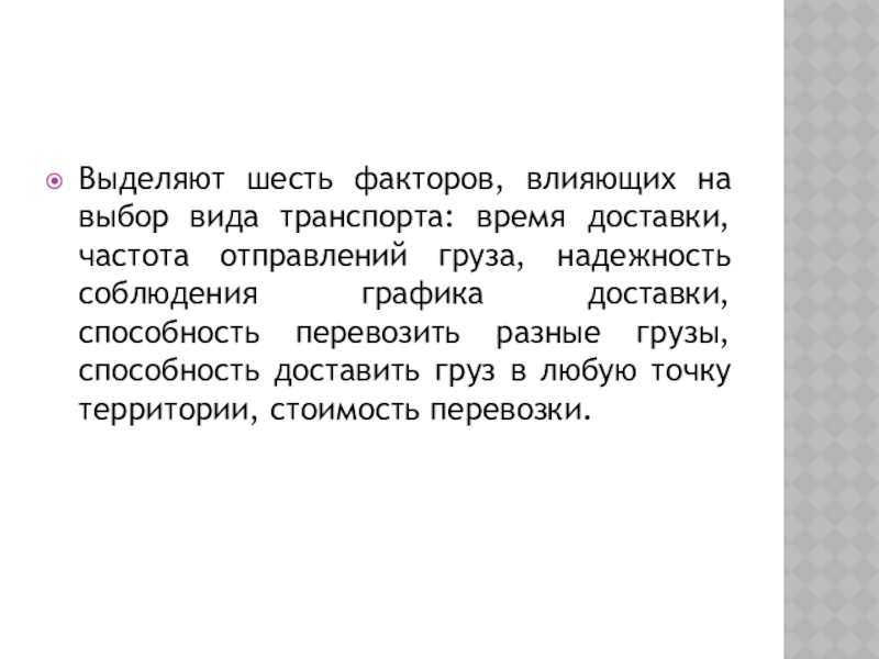 Слайд 10Выделяют шесть факторов, влияющих на выбор вида транспорта: время доставки,