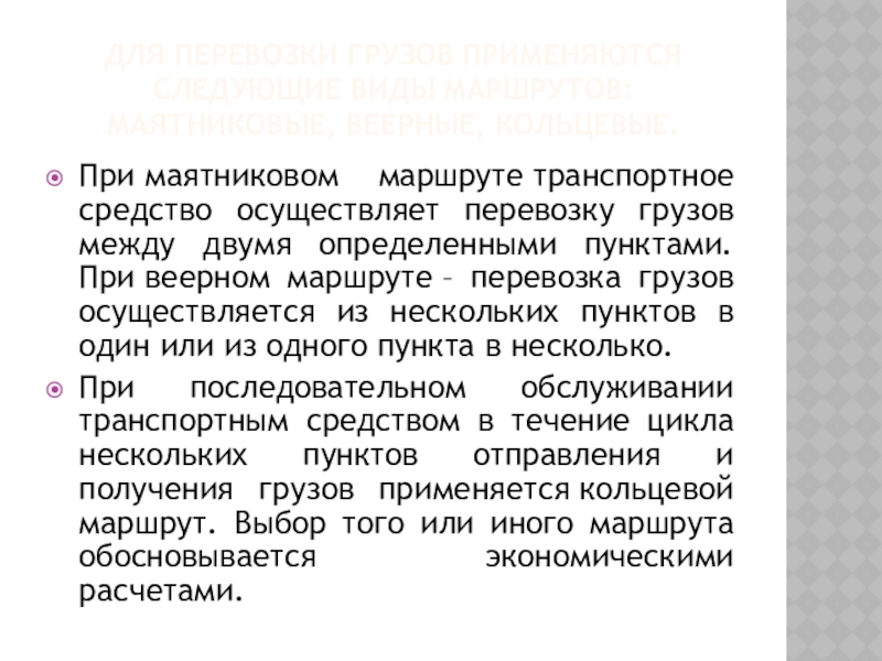 Слайд 4Для перевозки грузов применяются следующие виды маршрутов: маятниковые, веерные, кольцевые.