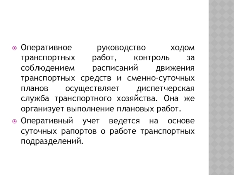 Слайд 9Оперативное руководство ходом транспортных работ, контроль за соблюдением расписаний движения