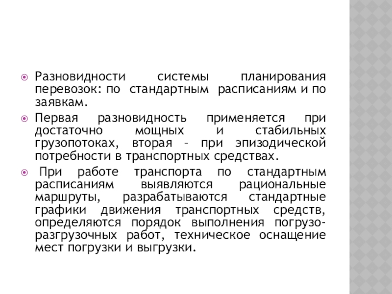 Слайд 3Разновидности системы планирования перевозок: по стандартным расписаниям и по заявкам.