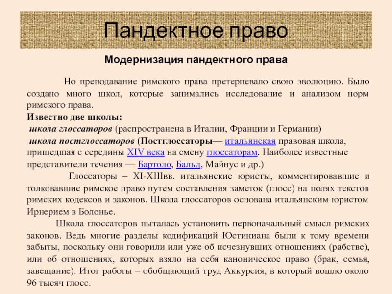 переработке. Было систематизировано, приведено в порядок по отраслям (как это только было возможным) – торговое право, международное право, частное право. Если раньше занимались лишь толкованием норм римского права, теперь пошли дальше – попытались применить данные нормы на практике, а также приспособить римское право к новым условиям.